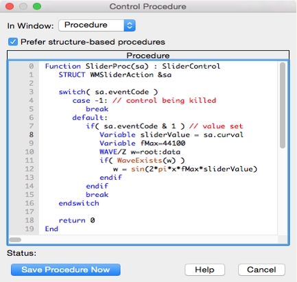 創(chuàng)建了框架過程。在此對話框中或之后在過程窗口中添加自定義代碼。在這里,添加了值設(shè)置代碼,該代碼重新計算了單音音頻波,該音頻的頻率由滑塊控制,作為44100 Hz采樣頻率的。其余文本時滑塊控件的基于結(jié)構(gòu)的框架代碼。